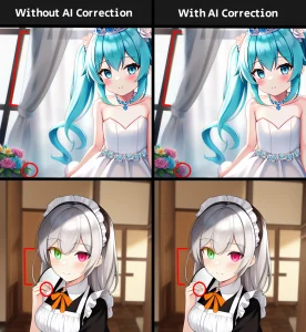 - Avoid something that make character hold on too. Example: She is holding a mic, she is holding glass of water, etc… (Sometimes, AI Correction failed to correct them)